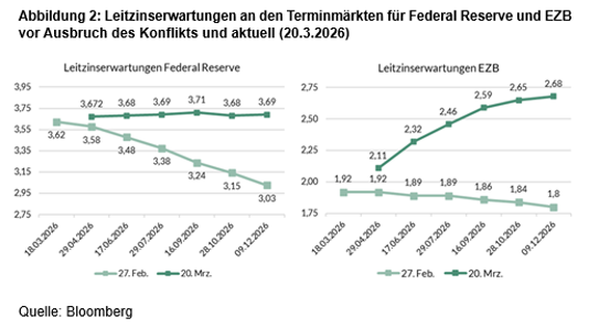 Im Endeffekt spricht die Einschätzung aber dafür, dass – vorbehaltlich einer möglichen expansiveren Ausrichtung der Fed unter der Leitung des designierten Fed-Chefs Kevin Warsh – Zinssenkungen der Fed unwahrscheinlicher geworden sind. Eine deutliche Mehrheit der FOMC-Teilnehmer kann sich allerdings noch eine einzige Zinssenkung bis zum Jahresende 2026 vorstellen – womit die Teilnehmer vermutlich von einer Entspannung der Situation am Golf ausgehen. Schaut man auf die Terminmärkte, scheinen die Marktteilnehmer von dieser Einschätzung derzeit nicht mehr überzeugt zu sein. Die Märkte haben Zinssenkungen in den USA mittlerweile ausgepreist (s. Abbildung 2). Doch natürlich hängt die weitere Entwicklung von der Stärke und Dauer des Energiepreisschocks ab.