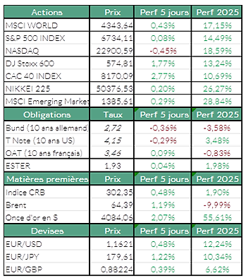 Du côté des matières premières : Le cuivre continue d’afficher une solide performance sur le London Metal Exchange, atteignant temporairement 11000 dollars la tonne métrique, grâce à un dollar affaibli et un regain d’optimisme à la suite de la fin du shutdown aux États-Unis. L’or affiche une progression d’environ 2,8% en données hebdomadaires et l’once d’or s’échange autour de 4100 USD. Les cours pétroliers terminent la semaine proches de l’équilibre, légèrement orientés à la hausse.