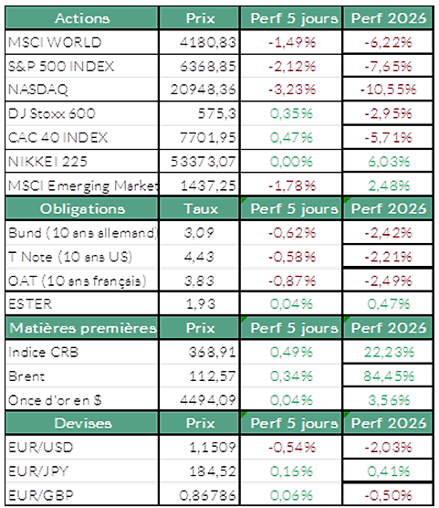 Dans ce contexte, l’Europe a fait preuve d’une certaine résistance. L’indice Stoxx 600 progresse légèrement sur la semaine (+0,35 %), mettant fin à trois semaines consécutives de baisse. Ce mouvement s’appuie sur un répit temporaire des prix du pétrole en début de semaine, ainsi que sur la bonne tenue des secteurs de l’énergie et de la santé. Mais cette accalmie ne doit pas masquer la tendance de fond : l’indice s’oriente vers son plus mauvais mois depuis le choc du Covid en mars 2020.