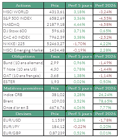 La semaine dernière, la volatilité a une nouvelle fois été forte sur les places financières, mais trois séances de fortes hausses ont permis aux principaux indices de finir dans le vert grâce à l’espoir d’une fin imminente du conflit au Moyen-Orient. Les incertitudes persistent toutefois et les dernières déclarations de Donald Trump n’annoncent pas une désescalade immédiate.